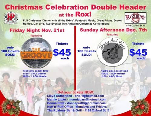 This year we will be offering two Christmas dinners at the Roxbury. Both events feature a full Christmas dinner, live music and dancing.